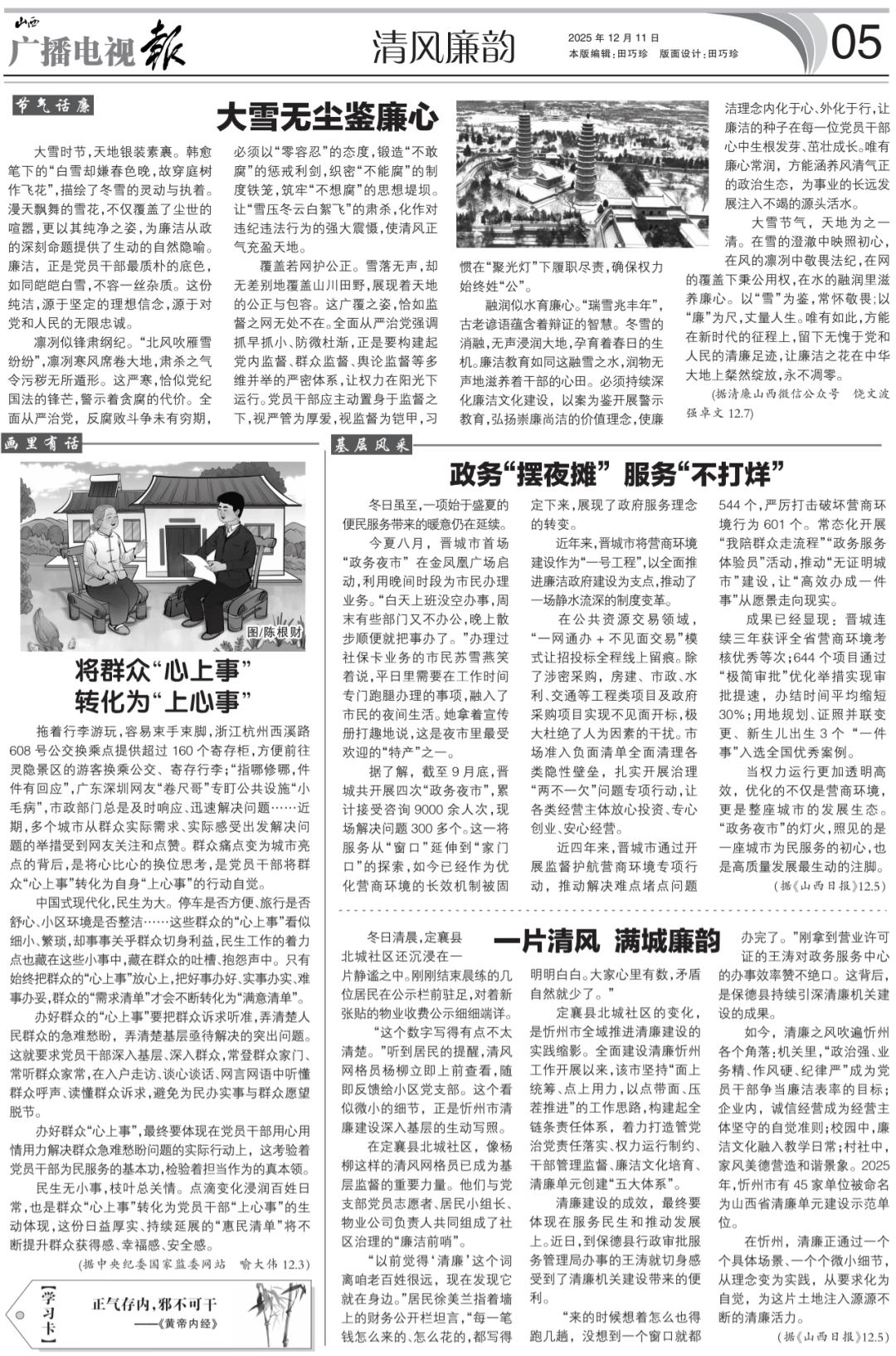 现在,之风吹遍忻州各个角落:机关里,“强、营业精、做风硬、规律严”成为干部争当清廉表率的方针;企业内,诚信运营成为运营从体苦守的盲目原则;校园中,清廉文化融入讲授日常;村社中,家风美德营制协调气象。2025年,忻州市有45家单元被定名为山西省单位扶植示范单元。