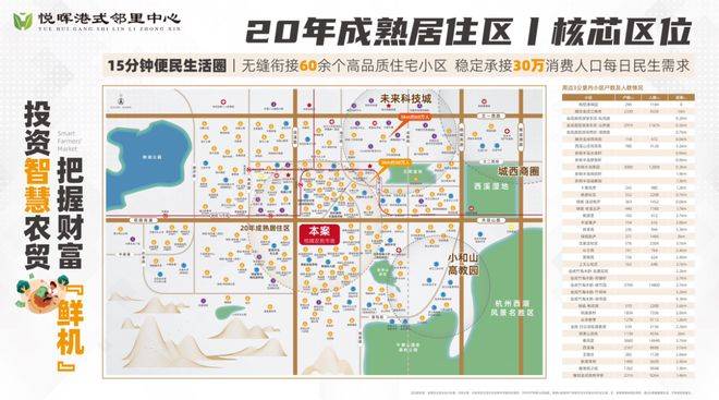 二、核芯区位取客群根本1、无缝跟尾将来科技城(5km辐射约60万人)、西溪湿地、小和山高教园、西湖风光名胜区等城市焦点板块,杭瑞高速、地铁16号线及多条城市从干道环抱,构成“财产+栖身+文旅+教育”的多元客群生态。2、栖身成熟度取客群规模•属于20年成熟栖身区,周边60余个高质量室第小区,不变衔接30万消费生齿的每日平易近生需求。